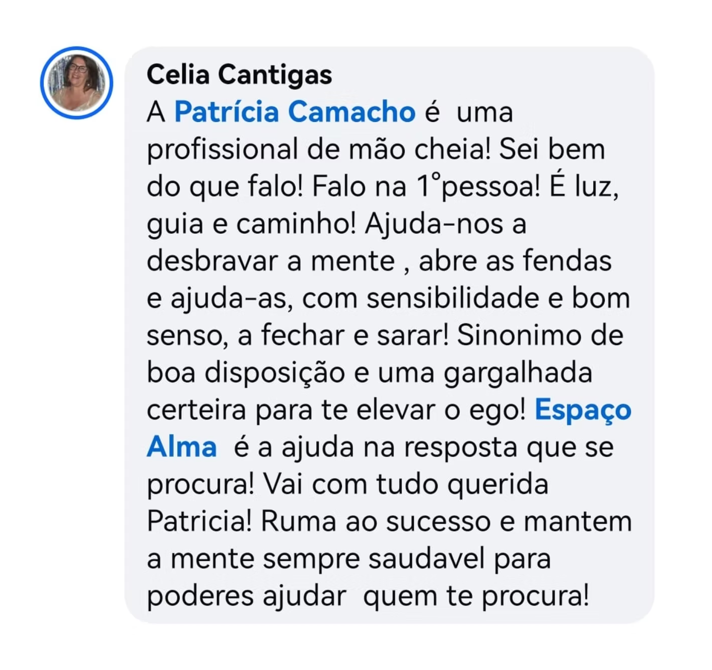 A Patrícia Camacho é uma profissional de mão cheia! Sei bem do que falo! Falo na 1º pessoa! É luz, guia e caminho! Ajuda-nos a desbravar a mente, abre as fendas e ajuda-as, com sensibilidade e bom senso, a fechar e sarar! Sinónimo de boa disposição e uma gargalhada certeira para te elevar o ego! Espaço Alma é a ajuda na resposta que se procura! Vai com tudo querida Patrícia! Ruma ao sucesso e mantém a mente sempre saudável para poderes ajudar quem te procura!