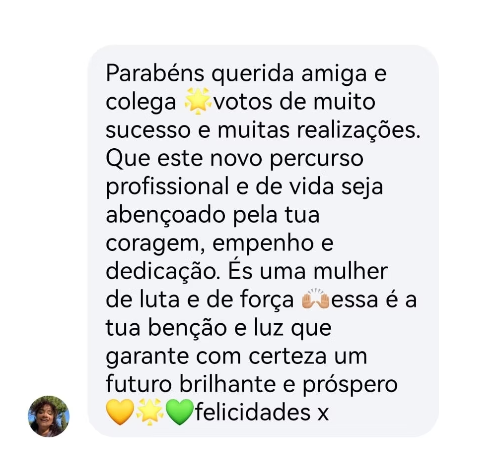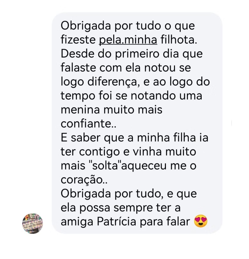 Obrigado por tudo o que fizeste pela minha filhota. Desde o primeiro dia que falaste com ela notou-se logo diferença, e ao longo do tempo foi-se notando uma menina muito mais confiante… E saber que a minha filha ia ter contigo e vinha muito mais “solta” aqueceu-me o coração… Obrigada por tudo, e que ela possa sempre ter a amiga Patrícia para falar 😍
